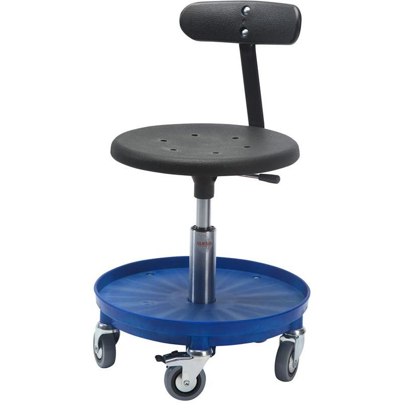 ÅKSTOL PU MED RYGGSTÖD OCH BLÅ VERKTYGSHYLLA 350-480MM