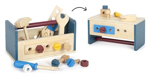 Speedy Monkey SP3017 2-i-1 arbetsbänk, verktygslåda 25 x 13,5 x 15 cm färgglad, träleksak för barn, kärleksfulla detalj-bra presentidé