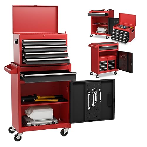 GOPLUS Metallverktygsskåp 2 i 1, verktygsvagn med hjul, verktygslåda, 5 lådor, krokar, justerbar hylla och halkfritt foder för garage verkstad (röd+svart)
