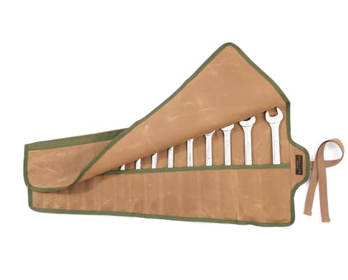 Verktygsrulle organiseringsväska, kraftig 473 ml vaxad canvasskiftnyckel rullväska med remmar, multifunktionell verktygspåse för metrisk, SAE (Khaki)