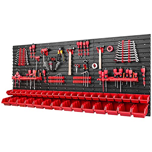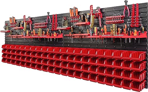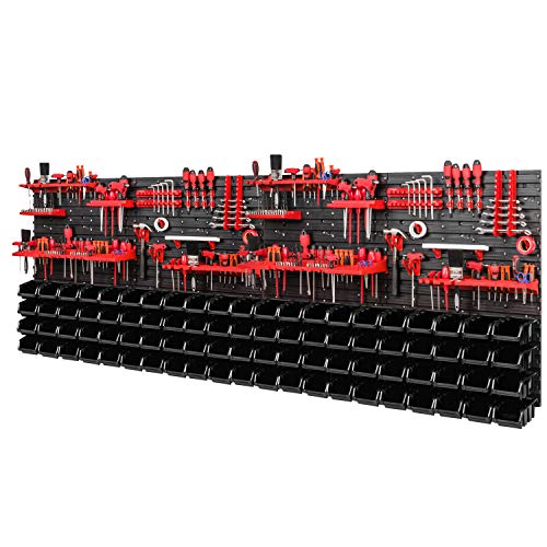 84 stapelbara lådor, verktygsvägg, 230 x 78 cm, verktygshållare, väggplatta, fästskenor, garage, lager, verkstad, hobby (röd/svart)