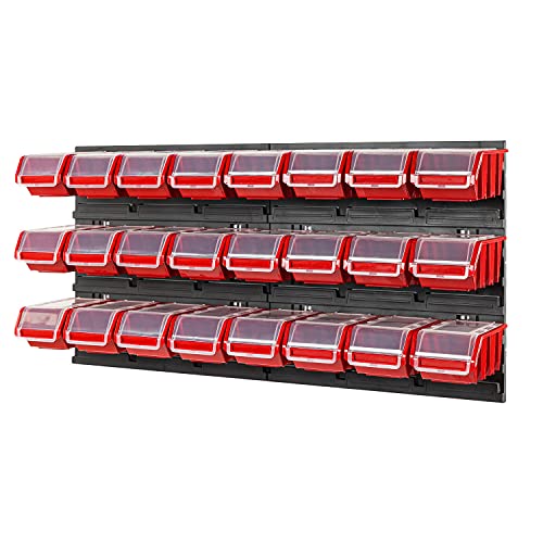 PAFEN Förvaringssystem stapelbara lådor med lock, vägghylla 772 x 390 – 24 stycken lådor – verktygsvägg verkstadshylla, sorteringshylla, svart/röd