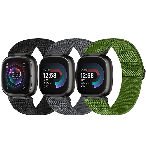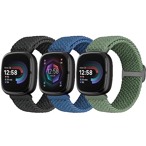 Yunshare 3 stycken flätat armband kompatibelt med Fitbit Versa 4/Fitbit Sense 2/Fitbit Versa 3/Fitbit Sense, mjukt elastiskt nylon sport sololoop ersättningsband kvinnor män