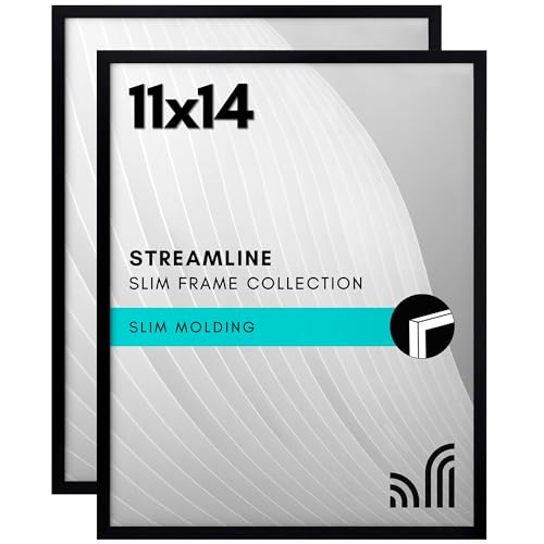Americanflat 11 x 14 bildram i svart – set med 2 – fotoram med tunn kant med okrossbart glas – väggbildram med hängande hårdvara ingår för horisontell eller vertikal skärm