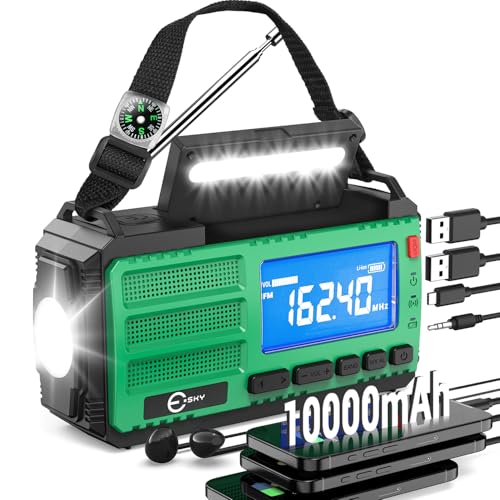 Esky Solradio 10000mAh, bärbar nödradio med AM/FM/NOAA vev med Powerbank, LED-ficklampa, lä, SOS och kompass, USB-uppladdningsbar, sol- eller vev för camping och avstängning