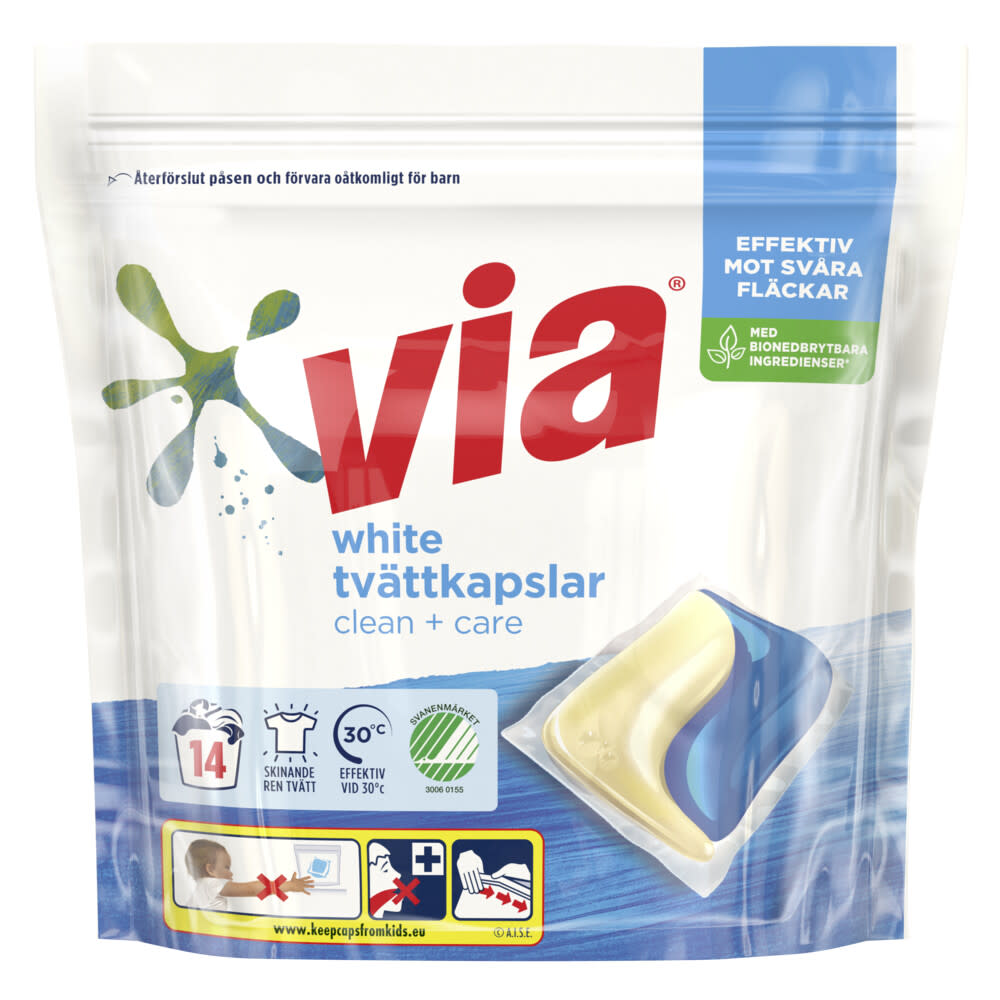 Tvättkapslar Via White Clean+Care, vit tvätt, 14 st