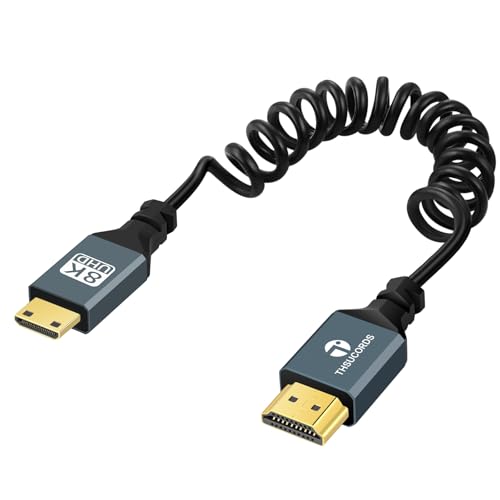 Thsucords 8K Mini HDMI till HDMI Spiralsladd Kabel, Ultratunn HDMI till Mini HDMI Hane till Hane Spiralsladd, stöder 8K @60Hz 4K @120Hz 48Gbps för Nikon/Canon DSLR, Videokamera, Bärbar Dator(90cm)