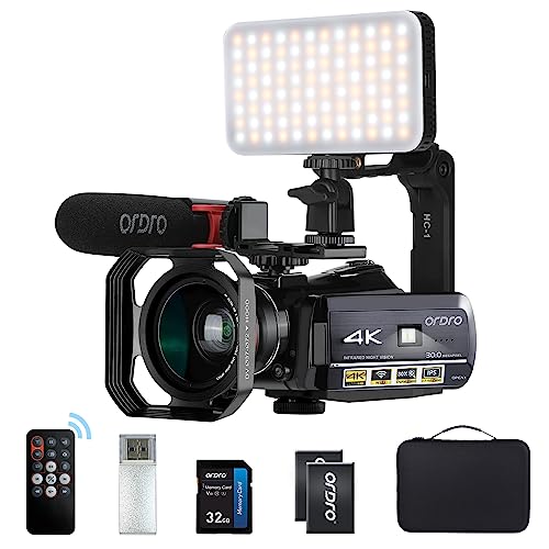ORDRO 4K videokamera UHD mörkerseende vlog spöke jakt kamera för YouTube 3,1 tum IPS pekskärm med IR-ljus handhållen hållare linsskydd 32G SD-kort och 2 batterier