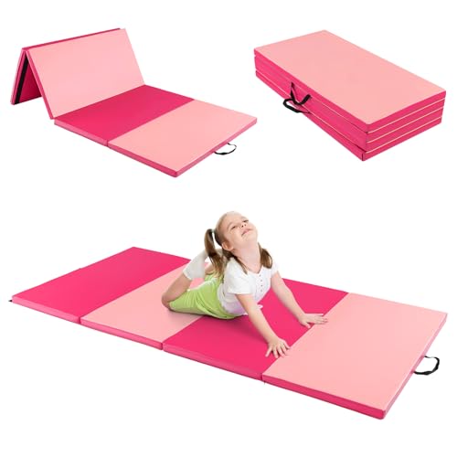 COSTWAY 240 x 120 x 5 cm mjuk golvmatta, gymnastikmatta, vikbar, yogamatta med kardborreband och 2 bärhandtag, gymnastikmatta, fällmatta, fitnessmatta för gymnastik, yoga, träning (röd + rosa)