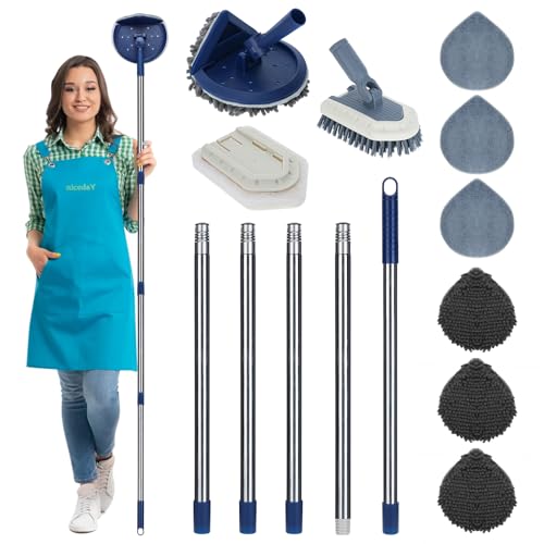 85 tum väggrengörarmopp med långt handtag, 180° vikbart golvrengöringsverktyg med 6 ersättningsdyna och 2 kakelborstar, väggbricka mopp för målade väggar, golv, tak, fönsterkakel badkar
