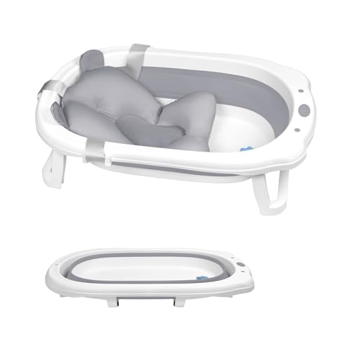 Vikbart babybadkar, baby nödvändigheter för nyfödd baby badkar med halkfri stödkudde resa bärbart hopfällbart babybad för nyfödda 0-24 månader spädbarn och småbarn (grå)