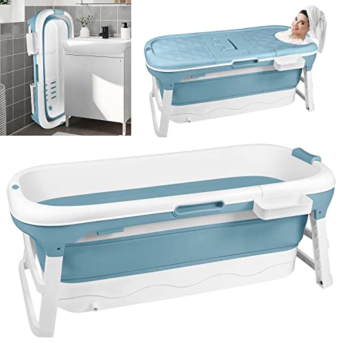 CRS Hopfällbart badkar för vuxna, storlek 138 x 62 x 52 cm, vikbart mobilt badkar, perfekt för små badrum, vikbar badstol, bärbart fällbart badkar för montering, blå