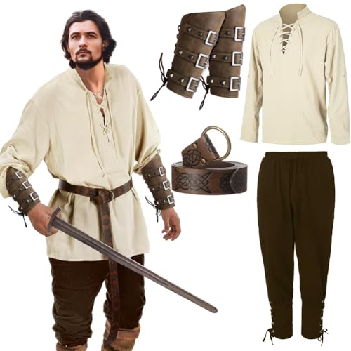 Herrnesänsanskostym, 5 delar, medeltid, retro, viking, långärmade skjortor, ankelband, byxor, PU-läderspänne, armskena, vikingbälte, tillbehör för Halloween, pirat, hippie, cosplay, fest