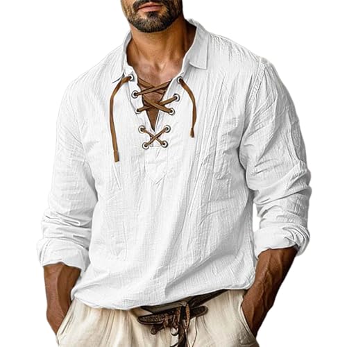 Långärmad vandringsskjorta för män andningsbar herr snörning skjorta linne vintage stil gotiska skjortor retro viking toppar pirat kostym klassisk medeltida långärmad höst Henley toppar skotsk Ghillie
