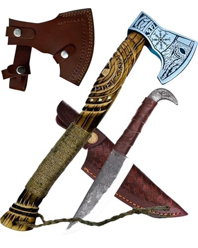 CraftTal-viking yxa 52 CN: med rabanhuvud kniv 2-i-1 set handgraverat ekträhandtag 1095 kolstål blad LARP yxa med läderskydd gåva för män.