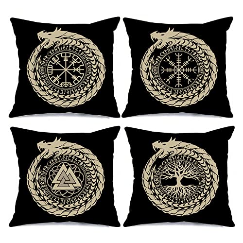 Nordics Vikings runor prydnadskudde, överdrag, livets träd, nordisk fantasidrake, kuddfodral, 4-pack, kompass, vägvisare, utomhus kuddöverdrag för vardagsrum, soffa, present (45 x 45 cm)
