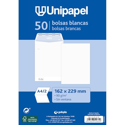 Unipapel | Förpackning 50 vita kuvert i papper 90 g | 162 x 229 mm | Rak stängning | Autodesk självhäftande silikonremsa | Övre öppningen | FSC | Perfekt för A4-dokument vikta i 2 eller a5 utan