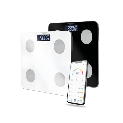 Avilia - Smart digital våg i härdat glas med app för fullständig kroppsanalys, stor LCD-skärm, steg-på-teknik och fleranvändarfunktion för familjens viktkontroll