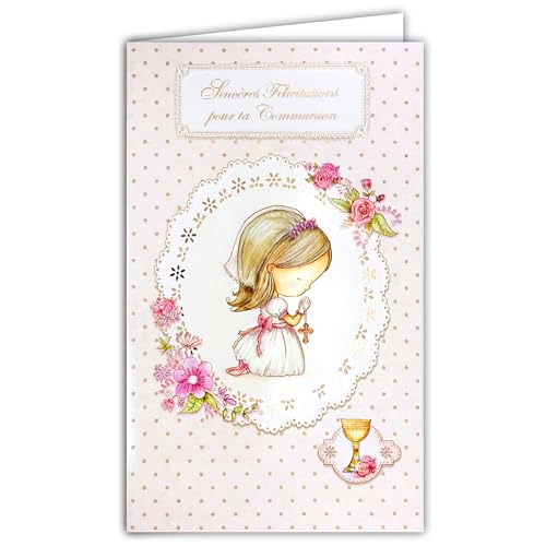 19-640 kort med kuvert uppriktiga grattis till din nattvardsflicka kristna kors katolska blommor rosa vin kopp kalkbägare traditionell illustration - tillverkad i Europa