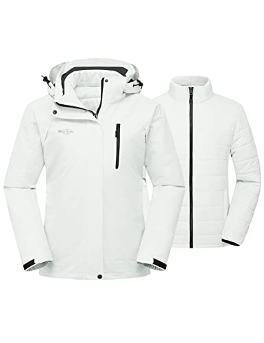 Wantdo Dam varm vinterjacka avtagbar innersko 3-i-1 jacka vattentäta snowboardrockar huva vindjacka, Vit, M