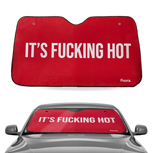 Fisura – Aluminium solskydd för bil med texten "F*cking hot". Original vindruteskydd 130 x 70 cm. Reflekterande skärm som blockerar UV-strålar och minskar värme.