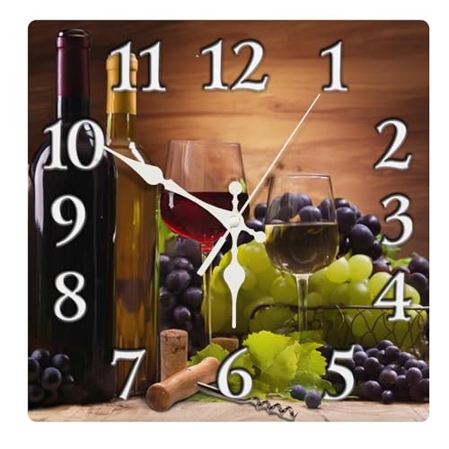 Britimes fyrkantig väggklocka tyst icke-tickande batteridriven klocka 30 cm, glasögon rött vitt vin vindruvor heminredning för vardagsrum, kök, sovrum och kontor
