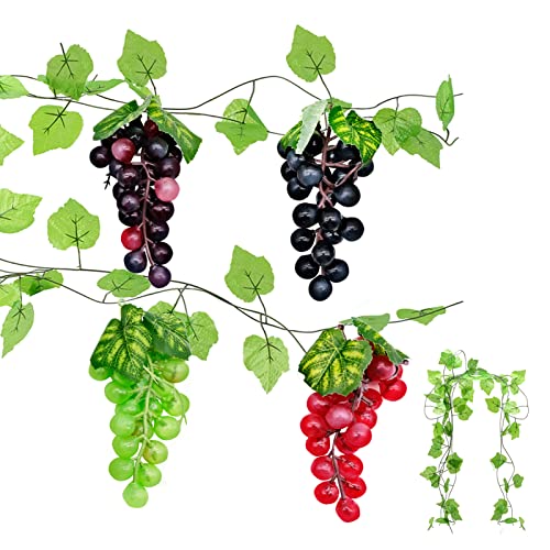 Bakiauli 4 spett konstgjorda druvor, druvspett av plast med 2-pack konstgjorda vindruvor, vinrankor, konstgjord frukt och grönsaksdekoration för fotograferingsrekvisita