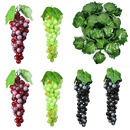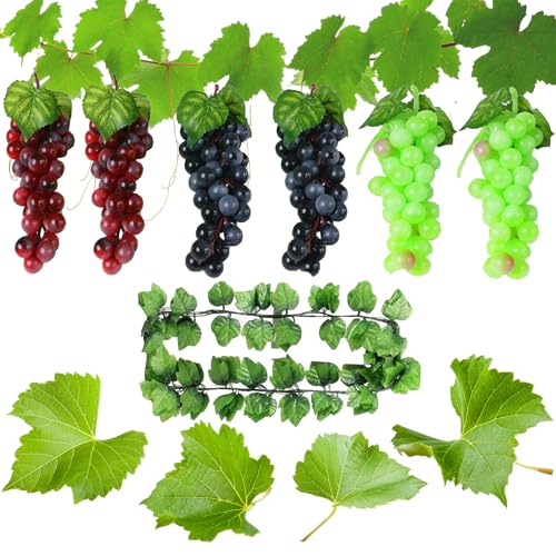 6 stycken konstgjorda vindruvor + 1 utrustning girlang vinranka, dekoration plast vindruvor, för vindekoration konstgjord fruktrekvisita, fest bröllop trädgård kontor (3 färger), Morlight 061, 17