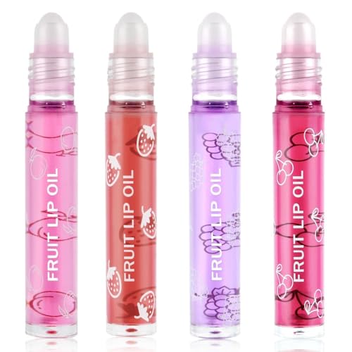 AOOWU 4 St Återfuktande Läppolja-Set, Fruktsmakande Fyllig Läppolja För Torra Läppar, Långvarig Läppglödbalsam Läppvård, Genomskinlig Återfuktande Läppglans Utan Klibbig (Persikor, Jordgubbar, Vindruvor, Körsbär)