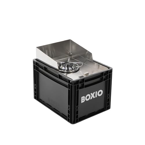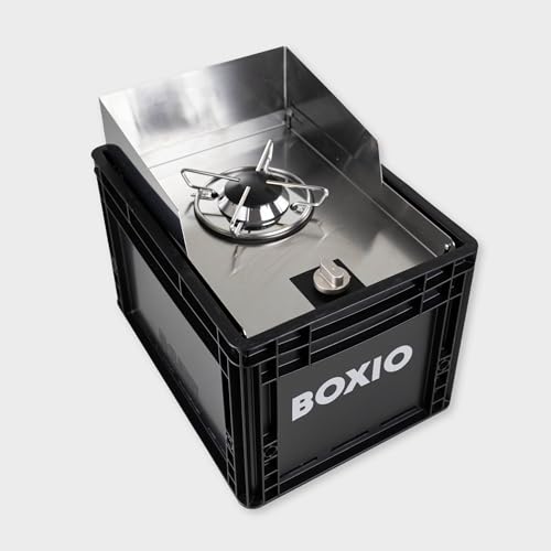 BOXIO – COOK: Rostfritt stål allt-i-ett campingkök med förvaringsutrymme och vindskydd, gaspatroner campingkök för camping, utomhus, Vanlife och som patronkokare på mobila försäljningsstativ på