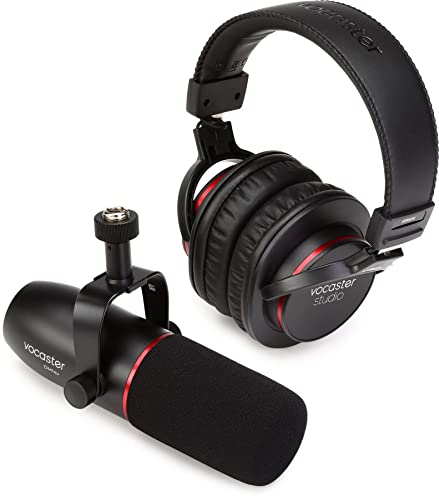Focusrite Vocaster sändningskit, dynamisk mikrofon för sändningskvalitet och hörlurar med stängd baksida för podcasters, mikrofon med inbyggt vindskydd och stötfäste, XLR-kabel ingår