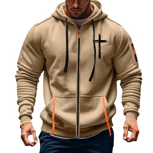 Generisk sweatjacka herr med huva, herr hoodie med dragkedja rockar Jesus topp långärmad tröja sporttopp ledig tröja känguruficka övergångskappa vindtät tröjor, kaki, L