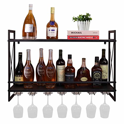 CNNINGYI Industriella vägg-vinhyllor med glashållare, 31,5 tum rustika metall-multifunktionshyllor, 2-våningshyllor för upphängning, vinhållare, vintillbehör, flaskhållare, glashylla, vägghylla