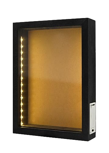 hvfun 20 x 38 cm rustik svart trä skugglåda med lampor, LED-ljus display fodral för vinkorkar, biljetter och kreativa utställningar, konstnärliga presentationer