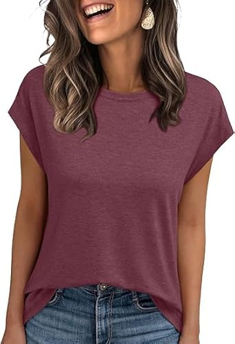 Tuopuda T-shirt damer, sommartoppar, rund hals, toppar, kortärmad blus, eleganta baströjor med puffärmar, fritid, tunika, skjorta, stretch, jersey, damblus för vår, sommar, höst, Vinröd, XL