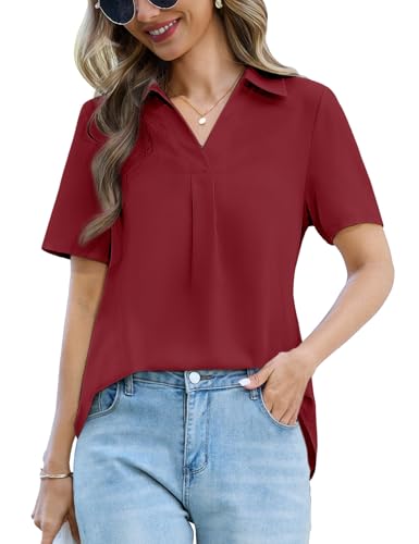 UMIPUBO Damskjorta Sommar Kortärmad V-Ringning Bekväm Ficka-Toppar Elegant Blusar Tunika Sommar Blus Work Tröja Klassisk Toppar, Vinröd, L