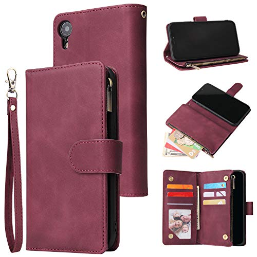 UEEBAI Plånboksfodral för iPhone XR, premium vintage PU-läder, magnetisk stängning, handväska, dragkedja, ficka, stativ, korthållare med handledsrem, TPU stöttåligt flipfodral – vinröd