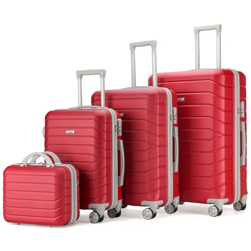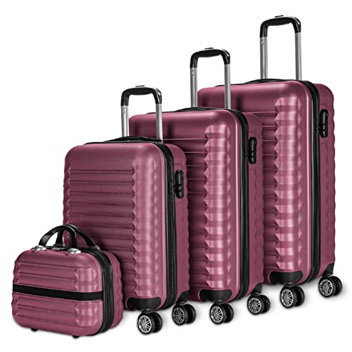 tectake® Resväskor Set i 4 delar, Bagageset med Hjul och Sminkväska, Kabinväska Metallic-look, Handbagage Väska, Ergonomiskt Teleskophandtag, TSA kombinationslås, Tysta Vridbara Hjul - Vinröd