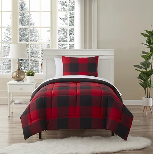 Sängkläder i en väska, 5-delat mjukt duntäcke för alla årstider, med alternativt täcke, matchande lakan och örngott (för enkelsäng, bison rutigt vinröd/svart)
