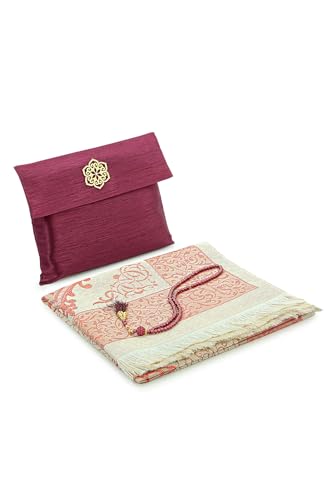 ihvan Muslimsk bönematta och pärlor med elegant väska i ”slub”-tyg, janamaz, sajadah, mjuk, islamiska gåvor, bönematta i tafttyg, vinröd