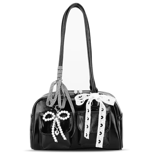 HiTotes Y2K axelväska rosett handväska för kvinnor läder vinröd väska Y2K väska röd väska Ita väska japansk tygväska estetisk kokettväska, A01-svart, 29cm