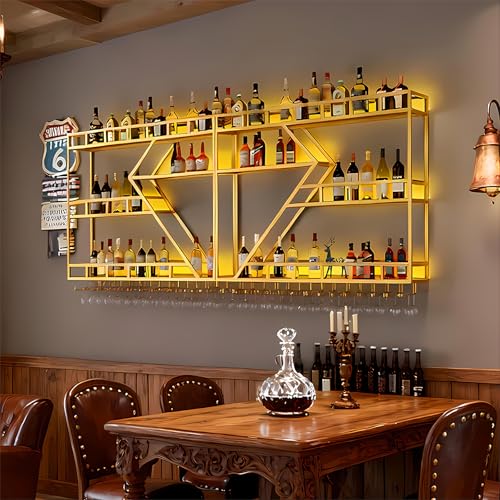 KEPMOGOH Vinställ väggmonterat med glashållare trä metall flaskhylla, barhyllor med vinglashållare, vinhylla, sprithylla vinförvaringsställ för hemrestaurangbarer (Guld, 3 Nivåer, 160cm)