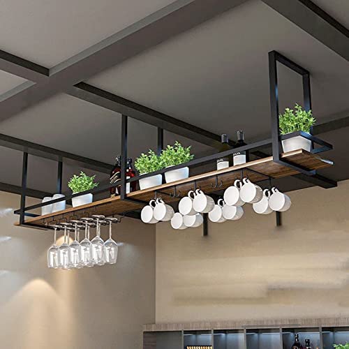 Hängande vinställ - Vinglashållare i taket - Hållare för vinglas i smidesjärn i massivt trä, hängande förvaringsställ i tak, vintage väggdisplayställ, lätt att installera (storlek: 140X30X50