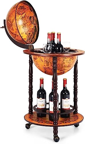 KOMFOTTEU Vinflaskhållare med hjul, jordglob bar, eukalyptus vinställ i trä, barvagn, minibar med hjul i klassisk stil (45 x 45 x 88 cm, brun)