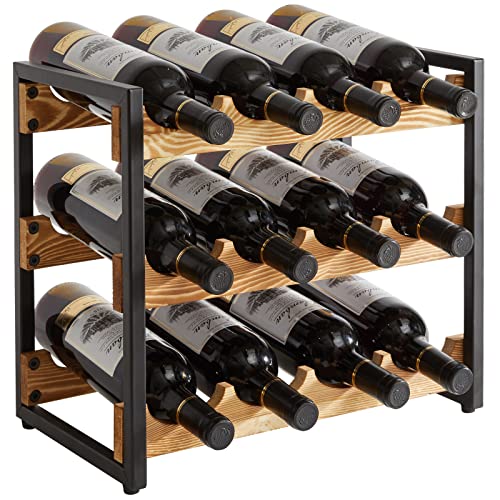IBUYKE Industriellt vinställ, bänkförvaringsorganisatör, fristående med metallram, 3 nivåer 12 flaskor, perfekt för hembar display, kök, matsal, skafferi, skåp, vintage svart, TMJ904H