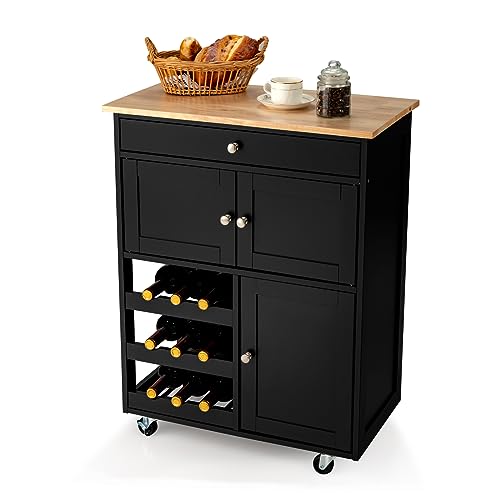 GOPLUS Köksvagn på hjul, serveringsvagn med 1 låda, 2 skåp och vinställ, rullvagn av trä, gummihjul, metallhandtag, i lantlig stil, för kök restaurang bar (svart)