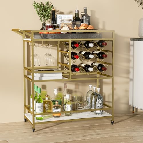 DAWNYIELD 3 nivåer mobil dryckesvagn bar serveringsvagn på hjul med vinställ och glashållare modern rullande drycker förvaringsvagn för hem kök fest bar (guld)