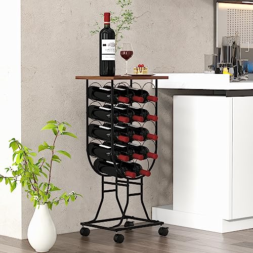 GIANTEX Vinställ för 14 flaskor med låsbara hjul, metallvinhylla med träöverdel, vinställ i rustik stil för bar, kök, matsal
