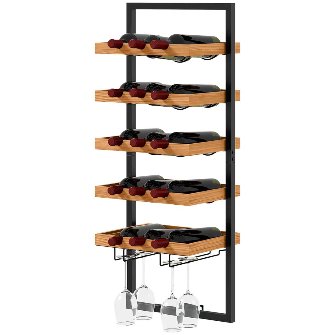 Väggmonterat vinställ med 5 våningar stapelbar vinflaskhållare Vinställ för 15 flaskor och 4 glas Furu Stål för kök Matsal Bar B