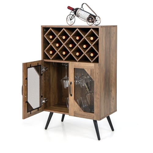 KOMFOTTEU Vinställ för kök, industriellt skåp med avtagbar hylla med 11 flaskor och kopphållare, bufféskåp med 2 nätdörrar och anti-mögel, för matsal, vardagsrum